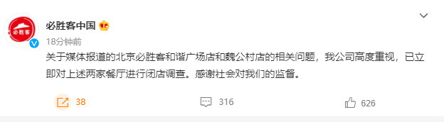 速途网7月20日消息(报道:李邵彤)今日,必胜客官方对新京报报道的多种食品安全问题回应。必胜客表示,对于媒体报道的北京必胜客和谐广场店和魏公村店的相关问题高度重视,已立即对上述两家餐厅进行闭店调查。