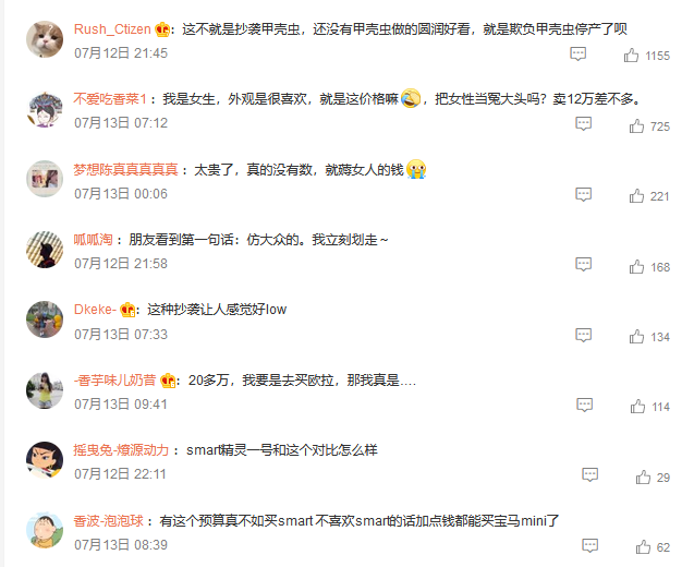 或许是欧拉“低估”了女性用户对汽车的认知,又或许是欧拉的“算盘”打得太响。社交平台上,随处可见“把女性当冤大头吗?卖12万差不多。”“好看重要,但汽车这种大件,性能也要考虑,现在的女孩子们都是内外兼修”等评论。