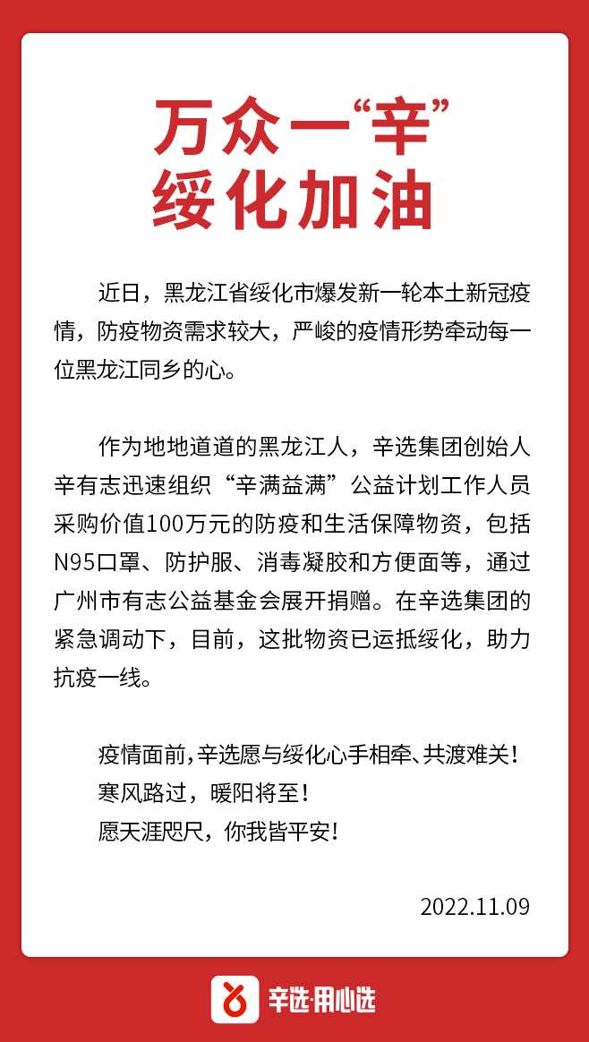 黑龙江青年企业家辛有志在得知绥化疫情后,组织辛选团队主动联系共青团黑龙江省委,根据当前绥化市疫情防控急需生活保障物资的需求,辛选迅速采购价值100万元的防疫和生活保障物资,包括N95口罩、防护服、消毒凝胶和方便面等,紧急驰援绥化。