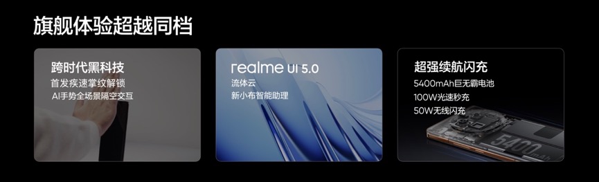 综合体验方面,真我GT5 Pro出厂搭载realme UI 5.0系统,全新的流体云、文件中转站、新小布智能助理等多项功能,给用户带来更高效、更智慧、更好用的系统体验。真我GT5 Pro还搭载万能红外遥控、全方位感应增强版NFC、X轴线性马达、杜比全景声双扬声器、IP64防尘防水等功能,用更全面的旗舰体验,打造越级体验新标准。