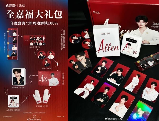 最后,值得关注的是此次直播周大生还发布了全新的任嘉伦周边,“任意选”三件套大礼包、“嘉温暖”五件套大礼包、“全嘉福”七件套大礼包,其中内含【心上任】小卡、【意中任】徽章、【独嘉记忆】透卡、【任享温暖】手套、【嘉景如画】镜子画、【织梦嘉愿】毛毯、【为爱嘉能】充电宝,每一件周边都心意满满,超级暖心~