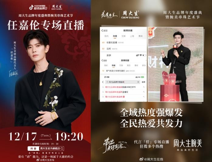 同时,周大生将此东方色藏匿于宝藏时刻当中,开启了《周大生品牌年度盛典暨腕美串珠艺术节》专场直播,实现全域热度爆发,狂揽微博、抖音平台等多个热搜。
