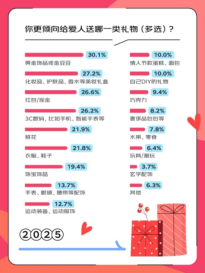 黄金饰品、美妆礼盒、红包是礼物TOP3的热门选择,3C数码产品紧随其后,手机、智能手表等3C数码成为实用型礼物的选择之一,精明的年轻人表示,今年国家补贴范围拓展至更多3C品类,有国补补贴的礼物真香。