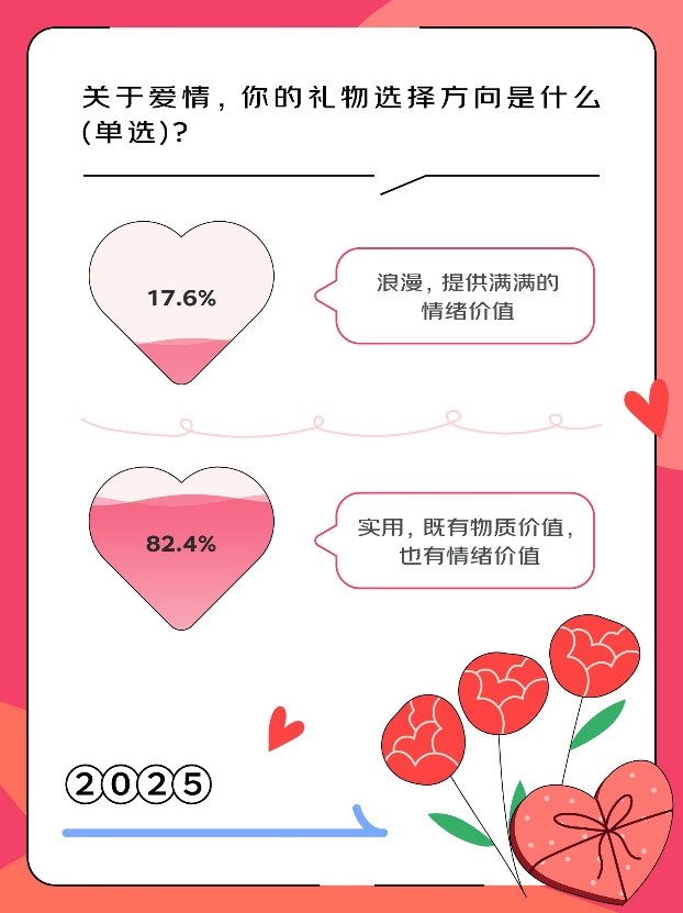实用型礼物更受欢迎。调研显示,82.4%的人关注礼物的实用价值,情绪价值在实用价值基础之上更让人快乐。