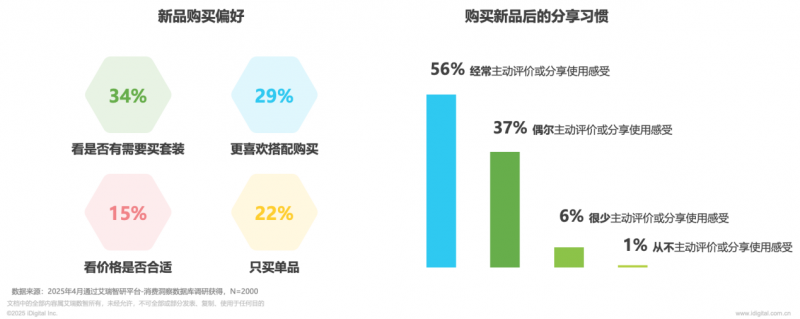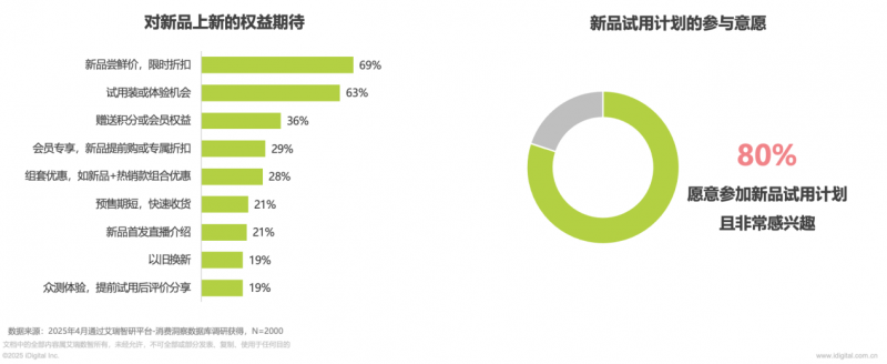 随着体验经济持续渗透,消费者普遍期待尝鲜优惠价,并对产品试用机会表现出强烈需求。消费者试用计划参与意愿高,体现出”风险前置化解”的消费心理。同时,消费者正自发形成UGC扩散生态,新品消费群体习惯分享使用心得,加之不少消费者倾向于搭配购买新品,为品牌构建”产品组合+社交裂变”的营销闭环创造了有利条件。
