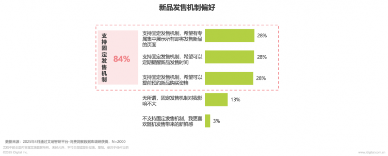 消费者对新品运营机制呈现明确期待。支持新品上新固定发售机制的消费者占比最高,其中不乏期待专属产品上新展示页面、定期提醒新品发售时间和提前预约新品购买资格等精细化服务。