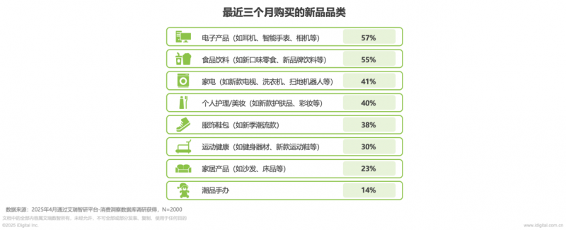 从消费行为的调研结果上看,近三个月购买电子产品新品和尝试食品饮料新品的消费者比例相当,反映出科技体验和生活品质升级正同步推动着消费市场的发展。