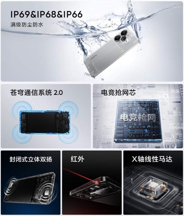 旗舰体验方面,其支持IP69+IP68+IP66满级防水,可短时抵抗高压和高温水流,让手机无惧生活中的各种意外。另外,双频GPS+四频北斗、X轴线性马达、Hi-Res立体双扬声器、360° NFC、红外遥控等实用配置,细节体验全方面看齐高端。