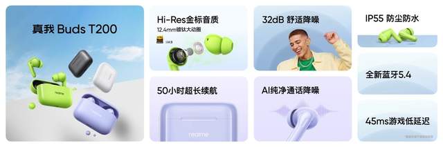 此次发布会还带来了真我TWS新品——真我Buds T200。作为百元级市场的“越级”之作,真我Buds T200搭载12.4mm镀钛大动圈,录音室级超高清音质通过了Hi-Res小金标认证,并升级支持32dB静谧降噪,提供50小时超长续航。全新的金属质感工艺,带来高端视觉和触觉体验。真我Buds T200起售价129元,今天正式开售。