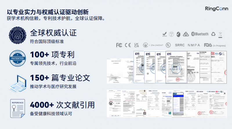 发展至今,RingConn智能戒指的监测指标已获得众多机构的认证和认可。在国内,RingConn智能戒指成功获得药监局的二类医疗器械认证,并且被多个顶尖科研和医疗机构采用,如上海瑞金医院等,作为其医学研究的关键监测和数据采集工具,助力健康监测和科学研究发展。