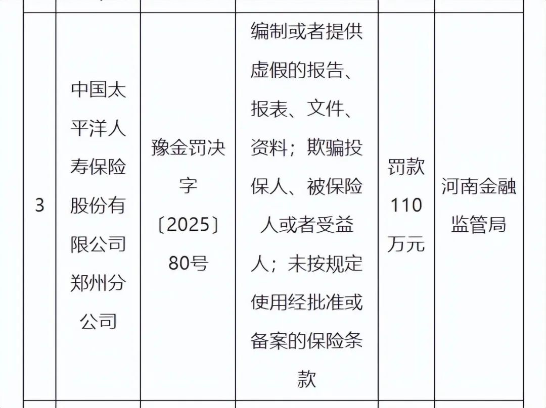 今年7月4日,太保寿险河南分公司因“给予投保人、被保险人保险合同约定以外的利益”被罚款15万元。同时,郑州分公司因“编制或者提供虚假的报告、报表、文件、资料;欺骗投保人、被保险人或者受益人;未按规定使用经批准或备案的保险条款”,被罚款110万元,4名相关责任人被警告并罚款。