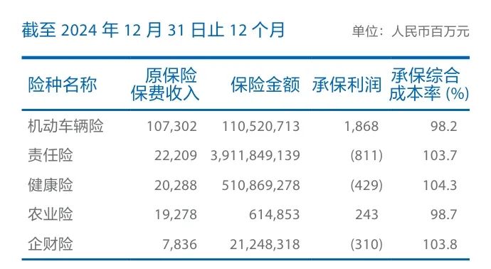 比较严峻的是,2024年,太保产险非车险业务的四大险种中,责任险、健康险、企财险3大险种的承保综合成本率均超100%,致使相应险种承保利润亏损,农业险虽未超过红线,但综合成本率仍高达98.7%,逼近盈亏红线。