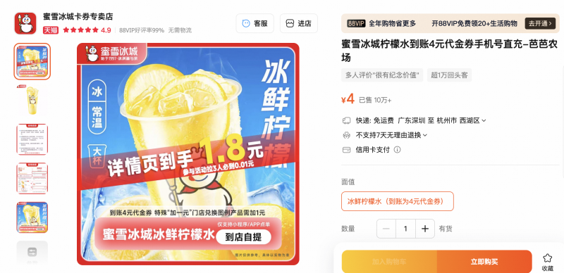 以蜜雪冰城卡券专卖店为例,该店铺主营各种优惠券,用户可通过淘宝平台购买优惠券后到店消费。自2025年6月20日入驻以来,不到三个月时间,该店铺累计成交金额就突破百万元。其中,柠檬水和冰激凌成为核心爆款,累计订单30多万。这种爆发式增长,印证了消费者对“即买即用”型数字消费的旺盛需求。