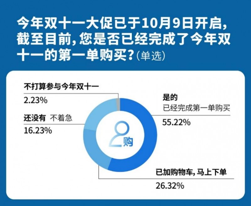 10月13日最新发布的《双11首购消费调研》结果显示,8成消费者首周已在参与双11,其中55.22%的消费者已完成双11首单购买,用实际行动为大促“投票”;26.32%的消费者已“将心仪商品加入购物车,马上下单”。
