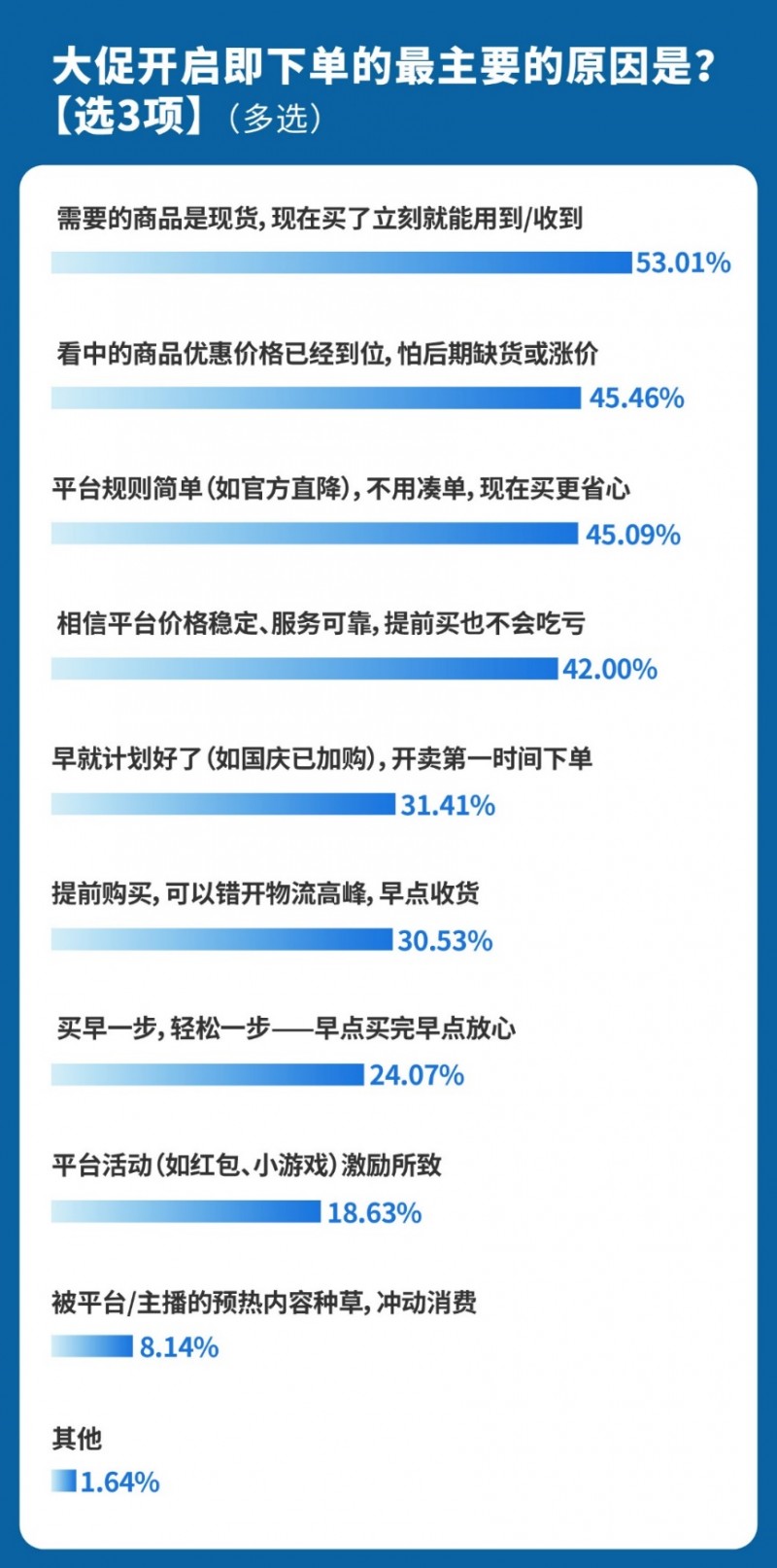 而直接促使消费者在大促启动初期便果断下单的主要原因,在于平台所提供的“确定性体验”——“现货发货”、”价格竞争力”、“规则简化”和“价保政策”等因素,共同构成了用户放心购买的信任基础,成为不少用户在大促刚开始就做出下单决策的主要动因。调研显示,53.01%的消费者之所以在大促一开启就下单,是因为“需要的商品是现货,现在买了立刻就能用到或收到”;近半数消费者表示,“当前优惠价格已到位,担心后期缺货或涨价”;同时,45.09%的消费者认为,“平台规则简单、官方直降、不用凑单”,让他们更愿意早买一步。此外,对平台价保机制的信任也成为重要推力——42%的消费者表示,正因“相信价格稳定、服务可靠”,才选择大促一开启即完成下单。