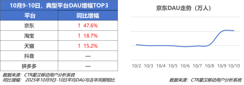 央视市场研究(CTR) 星汉移动用户分析系统数据显示,10月9日至10日,京东APP活跃用户数同比增长47.6%,增速位居行业首位。