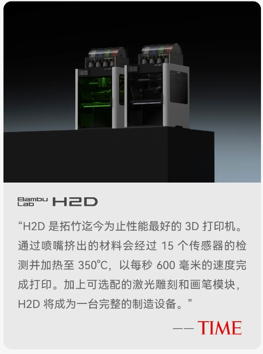 据《3D打印技术参考》统计,今年3月份发布的拓竹H2D仅10天销量就突破2000台,销售额超2400万元,强势登顶各大电商平台3D打印机销量榜单。更具含金量的是,拓竹H2D还被美国《时代》周刊评价为“迄今为止性能最好的3D打印机”。其双喷头设计、多材料处理能力及工业级精度,重新定义了桌面级3D打印机的技术标准,将高端打印的准入门槛又提升了一个新维度。