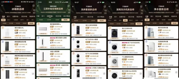 这一“智能大众化”的趋势,在家电行业体现得尤为明显 —— 品牌新品的市场表现,直接反映出消费者对智能科技的认可度。从天猫双11新品榜单来看,海尔智家旗下冰箱、空调、洗衣机、净水器等多款产品,均登顶所属品类 TOP1,共占据7大类新品榜单的头部位置。其新品持续成为市场爆款,恰恰是对当下“智能科技成大众刚需”这一行业趋势的精准呼应。