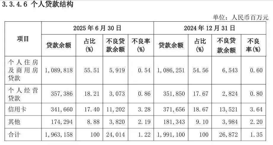 截至2025年上半年,兴业银行的个人贷款余额为19631.58亿元,较上年末减少1.4%,且整体规模已小于2022年;个人贷款平均收益率为4.3%,同比下降91bps;个人贷款的利息收入为418.27亿元,同比减少16.76%;个人贷款不良贷款率为1.22%,较上年末下降0.13个百分点,但仍高于1.08%的整体不良贷款率。