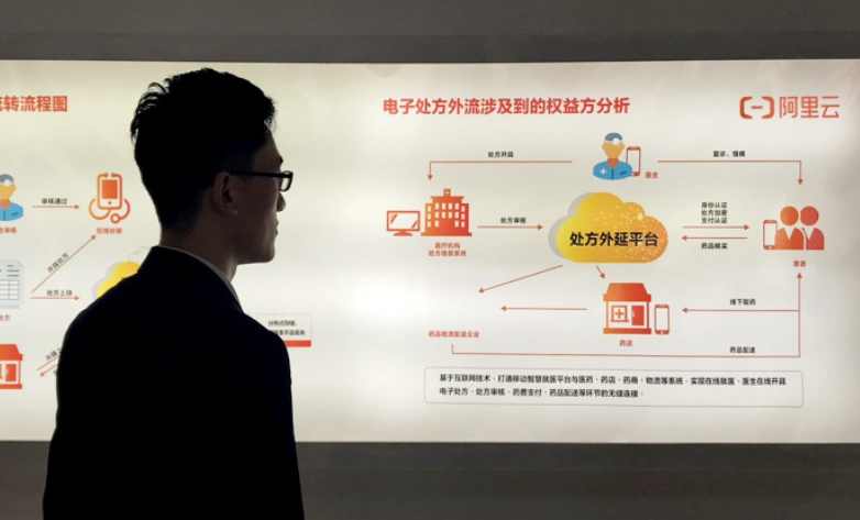 首届世界大健康博览会期间,一名观众观看阿里云区块链电子处方展示图