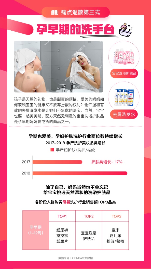 数据显示,纸尿裤、宝宝洗浴护肤品和童床类产品是孕早期妇女(1-12周)最爱选购的商品。