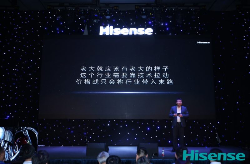 王伟表示,尤其是近一年来,电视价格战让行业销售额下降近14%,拖着电视市场一再朝着产品低端低质的泥淖下滑,如此下去整个电视产业只会死路一条。他说:“我们就是要卖比索尼更贵的电视,就是要带领中国电视行业走向产业链高端,如果不是海信,还会是谁?”