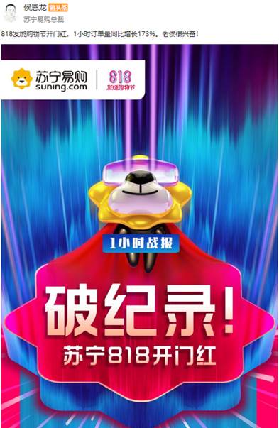 同一时间,苏宁易购总裁侯恩龙更新微头条:“818发烧购物节开门红,1小时订单量同比增长173%。老侯很兴奋!”