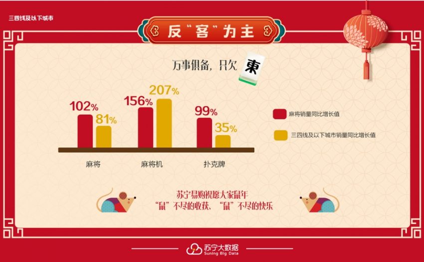 除此以外,春节作为“熬夜党”们的主战场,零食和麻将一直是必备物料,三四线城市在这其中的消费力也有了明显增长。苏宁数据显示,零食礼包销量同比增长137%,三线及以下城市销量同比增长158%;坚果礼包销量同比增长142%,三线及以下城市销量同比增长279%;麻将销量同比增长102%,三四线及以下城市销量同比增长81%;麻将机销量同比增长156%,三四线及以下城市销量同比增长达到了207%。