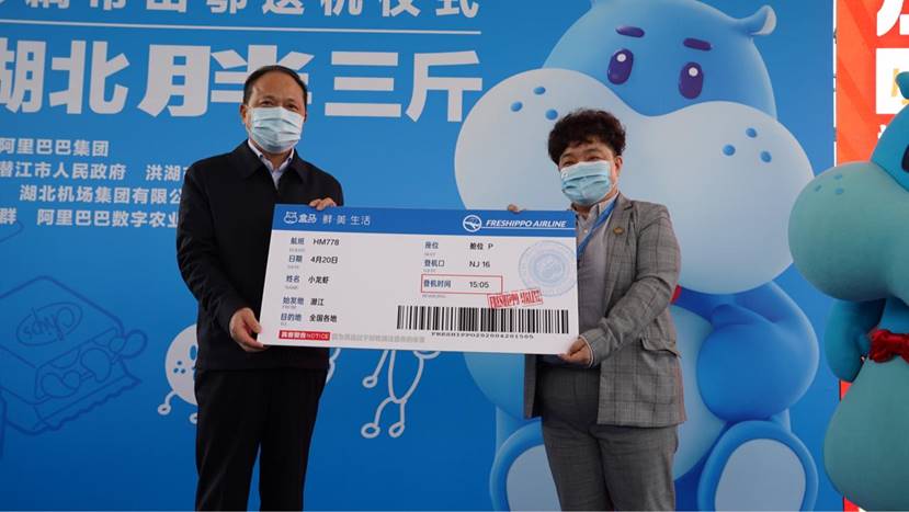 速途网4月20日消息(报道:李楠)今天下午,武汉天河机场,湖北省副省长万勇给众多生鲜农产品包装箱“派发了登机牌”。小龙虾、藕带随盒马包机出省。