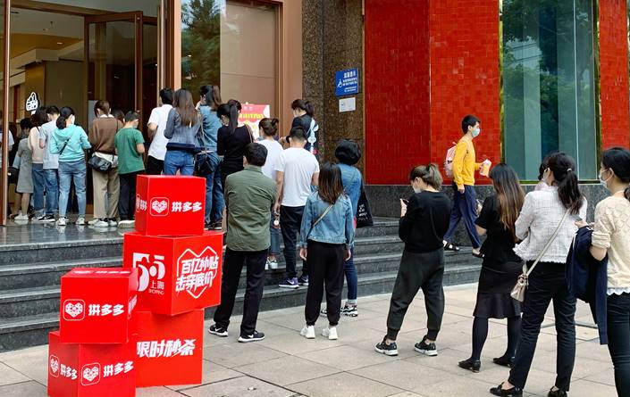 ▲5月1日,拼多多派发的65万张大额消费券投入使用,上海“五五购物节”的线下盛宴正式开启。其中,首批上线的新世界城10000张消费券,30分钟便遭抢购一空。(安舜摄)
