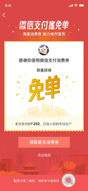 此次摇免单上线,是微信支付推出“微信支付商家消费券”小程序之后,进一步助力商家的计划。通过统一的线上入口和覆盖全国的数百家品牌,可以让各地的消费者都能参与到消费促复苏的进程中来。