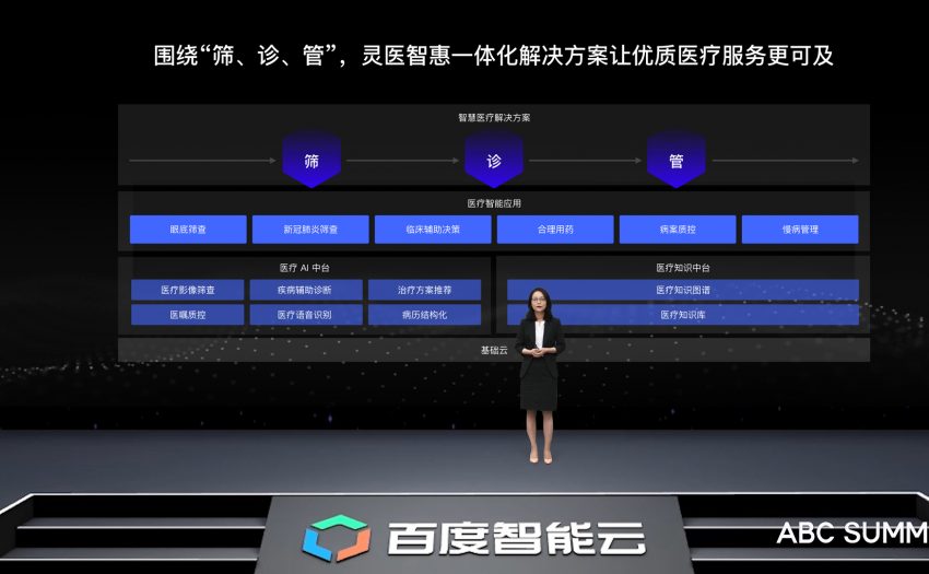 在智慧医疗领域,百度智能云副总经理、智慧医疗事业部总经理黄艳表示,基于多模态的医疗AI中台和权威专业的医疗知识中台为基础,AI赋能医疗大数据,围绕筛、诊、管等医疗场景推出了相应解决方案。据速途网了解,目前,“智慧医疗”已经服务300多家医院和超过1500家基层医疗机构,产品已经覆盖全国绝大部分的省市自治区,辅助数万名医生,服务人次超过了2500万。