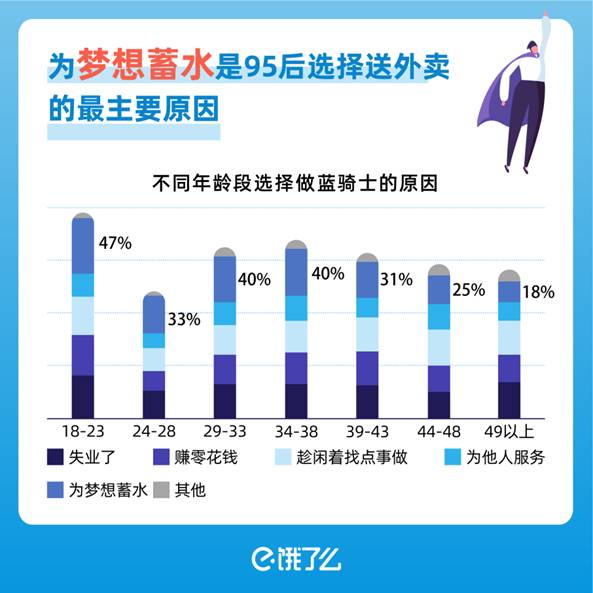 根据调查,95后群体中送外卖主要是为梦想蓄水,而在49岁以上的群体中,送外卖的第一大原因是由于失业。遭遇职场“中年危机”,零工经济为兜底个人梦想和家庭经济,提供另一种可能。