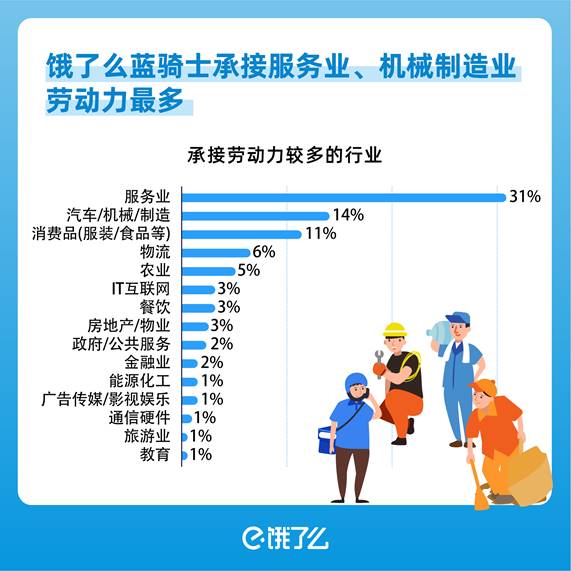 疫情之中,餐饮、文娱、培训等行业受到一定程度的影响。与此同时,外卖等行业的需求愈发旺盛。饿了么承接了更多来自于服务业和机械制造业的劳动力,服务业蓝骑士占到31%。劳动力在不同行业中流转,一定程度上稳定了特殊时期的就业形势。