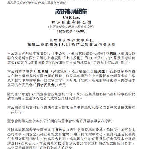 神州租车:陆正耀已辞任董事会主席及非执行董事职务 王辉 • 2020年6月10日 09:15 • 资讯 6月10日消息,神州租车发布公告称,陆正耀先生为将更多时间投入在神州优车股份有限公司的履职工作及其他业务之中,已辞任本公司董事会主席及非执行董事的职务。 赞 (0) 王辉 0 生成海报 10国外交官组欧洲直播天团 “中东欧优品云上展”拼多多开幕 上一篇 2020年6月9日 21:47 沃尔沃“525车主服务节”,体验更多贴心有爱的售后服务 下一篇 2020年6月10日 09:47