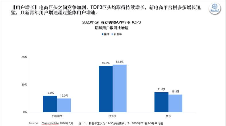 ▲报告显示,拼多多2020年第一季度增长迅猛,并成为唯一一家年轻用户增速超过整体用户增速的群体。这也意味着,有更多的年轻用户流向了拼多多。