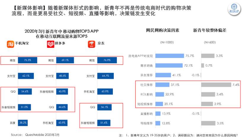 报告认为,新青年的购物决策流程,更容易受社交、短视频、直播等影响。他们可以通过微信、QQ和抖音等多个APP,接触到新电商平台。三大移动购物App,最主要的流量来源是微信,QQ和抖音两个渠道的流量占比过半。