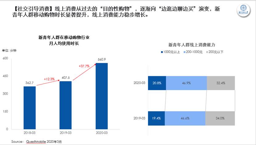 报告认为,这是因为新青年呈现出“社交引导消费”“粉丝经济引导消费”的特征。线上消费从过去的“目的性购物”,逐渐向“边逛边玩边聊边买”演变,进而提升用户黏性。共同拼单、分享购物等行为成为重要的线上消费行为之一。