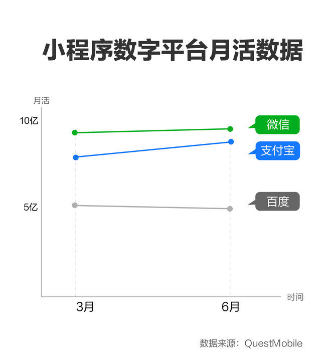 速途网8月14日讯(报道:乔志斌)今日,据第三方数据研究机构QuestMobile近期公布的数据,今年3月到6月,支付宝月活跃用户数(MAU)增势显著,增加了2700万。另外两大小程序平台中,微信月活跃用户数微增800万。