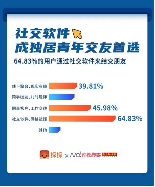 近日,在社交平台探探发布的《2020独居青年生活洞察报告》(以下称《报告》)中显示:64.83%的被调研用户选择通过社交软件来结交新朋友,且一、二线城市占比更高,线上交友成为不少独居青年们缓解孤独的“必选项”。可以看出,社交软件已成为单身独居青年们结识好友、寻找伴侣的重要途径之一。