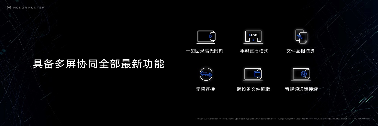荣耀猎人游戏本V700不但继承了荣耀MagicBook多屏协同的所有特点,还创新的加入了一碰回录高光时刻功能,玩家在酣畅游戏的时候,再也不担心错过刚刚发生的精彩,手机摇一摇,碰一碰触控板(华为分享连接区域内置于触控板),即可回录向前30秒,向后30秒的精彩游戏瞬间,录制完成之后直接同步到手机上,方便用手机快速剪辑和分享。