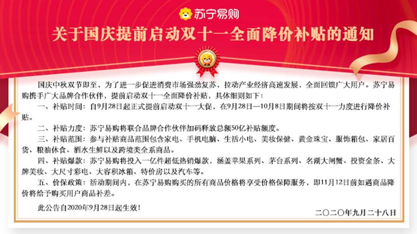 9月28日晚,苏宁易购发布重磅消息称,于9月28日提前正式启动2020年双十一大促,并将9月28日-10月8日的国庆双节定为双十一大促开启,出台50亿补贴额度释放、全品类补贴、投入一亿件超低热销爆款、价保延长至11月12日等政策,提前打响补贴战。