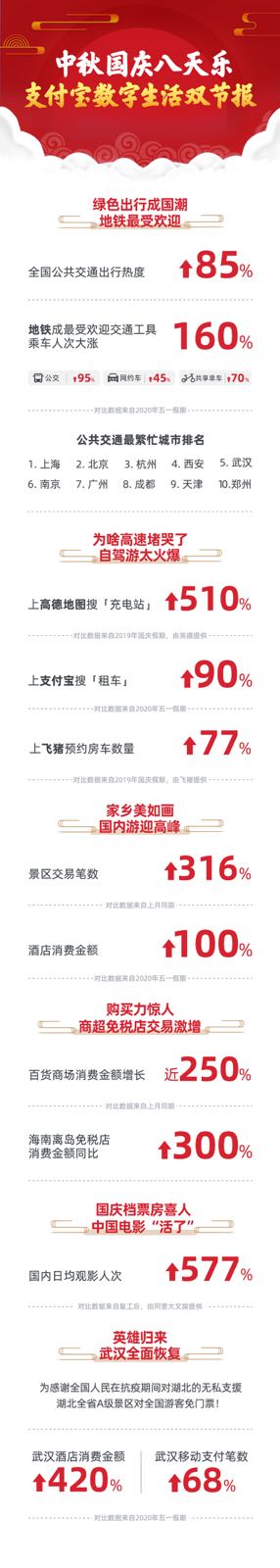 为感谢全国人民的抗疫支援,湖北8月起推出全省A级景区免门票等政策,“英雄城市”武汉的旅游业也随之升温,并在国庆迎来消费高峰。支付宝数据显示,“十一”期间,武汉移动支付笔数较今年五一上涨 68%,酒店行业消费总额激增420%。