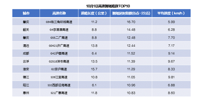 以十一当天为例,排名前十的高速拥堵路段主要集中在广东,其中G94珠三角环线高速肇庆段拥堵最为突出,6时至22时拥堵延时指数达16.70,平均车速仅为5.99千米/小时,其次是G4京港澳高速韶关段,G55二广高速肇庆段排名第三。
