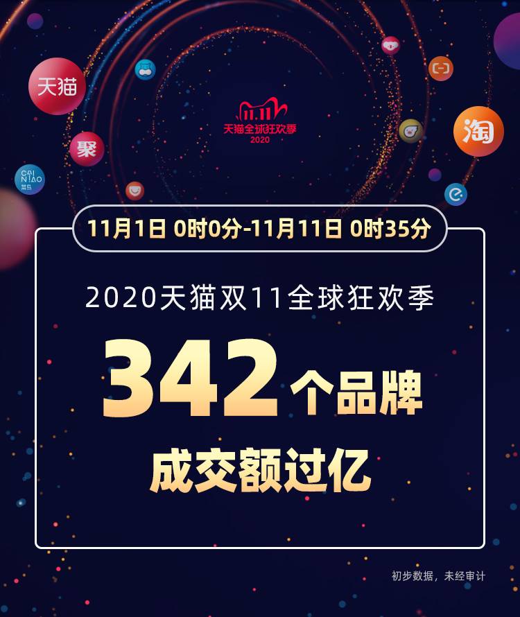 速途网11月11日消息(报道:李楠)从11月1日到11日0点35分,天猫双11全球狂欢季已有342个品牌成交额突破1亿元人民币。