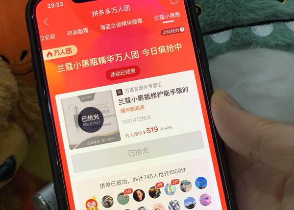 ▲双12期间,拼多多进口美妆产品销量同比去年增长310%。美妆大牌万人团兰蔻小黑瓶开团即售罄,SKII神仙水、海蓝之谜面霜、露华浓口红等爆款美妆也被热抢。