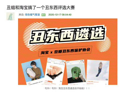 记者从淘宝求证获悉,“丑东西”征集确实正在进行中。负责此次评选的淘宝小二表示:“我们注意到社交网络中本来就有大量关于‘我在淘宝上发现了一个丑东西’的自然讨论,大家一边吐槽,一边对这些丑东西表达喜爱,这次的颁奖盛典是将年轻人最喜欢的丑东西做一个年度盘点,也是对淘宝商家的独特设计能力的集中体现。”