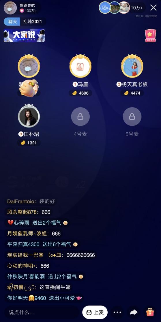 据悉,“大家说”是快手特别策划推出的聊天室系列直播栏目,在春节初一至初七,联动国内知名大咖医生、社会文化名人、商业大咖、娱乐明星等带来9场不同主题的对话,为广大用户献上2021年春节社交新体验。其中,“乱炖2021”是该栏目的第二场对话直播,邀请到知名编剧、影评人史航(@鹦鹉史航),著名诗人、作家冯唐(@冯唐),壹心娱乐CEO杨天真(@杨天真老板),以及制片人、作家田朴珺(@田朴珺)“上”麦畅聊。