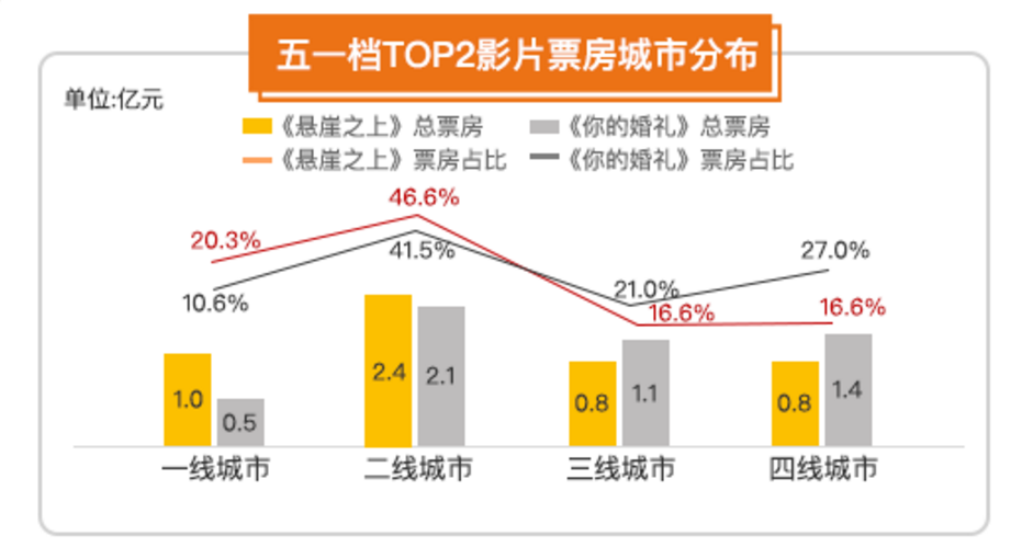据灯塔专业版数据统计,今年五一档拥有题材丰富的十余部影片上映,其中《你的婚礼》(5.12亿)、《悬崖之上》(5.05亿)与《秘密访客》(1.91亿)分别位列前三。