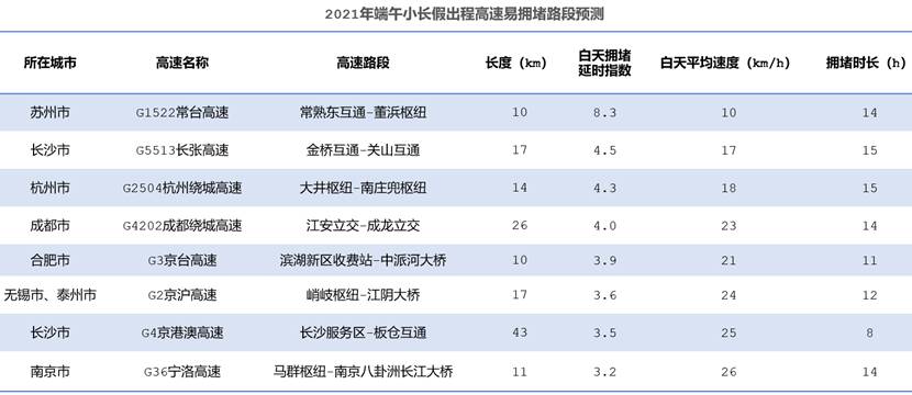 从易拥堵高速路段分析,出程阶段,预计6月11日全国高速出程较易拥堵的路段主要是G1522常台高速苏州段,白天拥堵延时指数为8.3,平均速度约10千米/小时,G5513长张高速及G2504杭州绕城高速紧随其后。